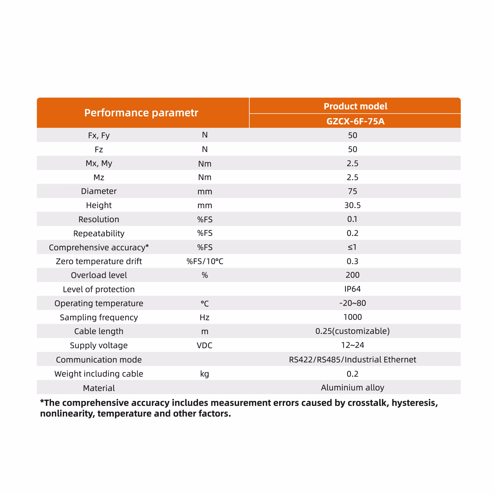 Force sensor GZCX-6F-75A is a small and medium-sized six-dimensional force sensor made of aluminum alloy, designed based on the principle of strain electrical measurement multi-axis joint calibration to improve accuracy, and match the end of most collaborative robots. The sensor has built-in signal acquisition communication module, using 485 communication mode, direct output force/moment value, easy to assemble and use.